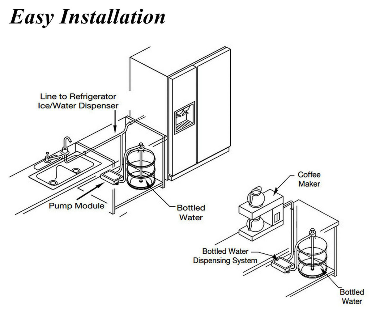 -El sistema suministra el agua embotellada bajo presión a un grifo de agua potable montado en el fregadero o a la entrada de agua de un refrigerador, una máquina de hielo, una cafetería u otro equipo.